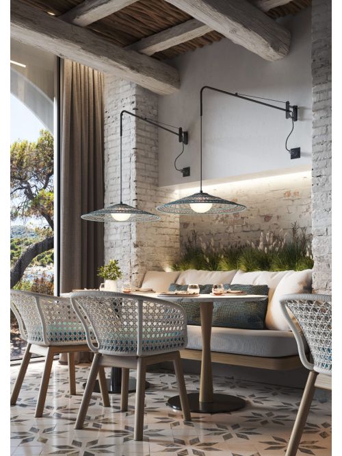 Die Bover Nans 55 A/98 ist eine Wandleuchte mit einem Leuchtenschirm aus handgeflochtenen Polyethylen-Fasern. Der lichtdurchlässige Leuchtenschirm hat einen Durchmesser von 55 cm und ist 12 cm hoch. Der Leuchtenarm dieser Wandleuchte ist um 180° schwenkbar. Die Leuchte hat eine E-27 Fassung und wird mit einer austauschbaren LED Retrofit betrieben. Die Wandleuchte wird mit 4 m langen Kabel und Stecker geliefert und ist in verschiedenen Farben erhältlich.