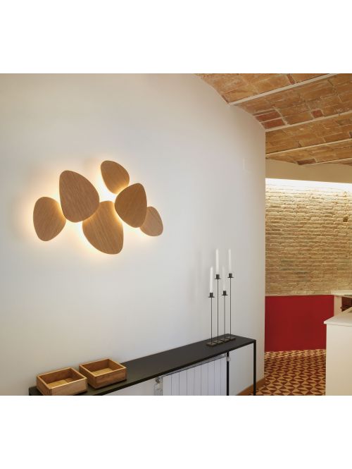 Die Bover Tria Set 6 LED-Wandleuchte wird von dem spanischen Hersteller Bover gefertigt. Diese LED-Wandleuchte besteht aus Holz und ist in den Oberflächen weiß satiniert lackiert und Eiche Natur erhältlich. Die sechs miteinander verbundenen Elemente dieser Leuchte verfügen zur Installation über einen einzigen Anschlußpunkt. Der Leuchtenkörper der Tria Set 6 von Bover ist 89 cm lang, 53 cm hoch und besitzt eine Tiefe von 11,5 cm. Die sechs einzelnen Elemente der Leuchte können leicht bewegt werden und geben indirektes Licht ab. Diese LED-Wandleuchte ist mittels eines Phasendimmers (TRIAC) bauseitig dimmbar.