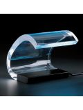 Die Oluce Cylinda 218 OR verfügt über einen Leuchtenkörper, der aus zwei zylinderförmigen Bestandteilen besteht. Der obere scheibenförmige Bestandteil ist in satiniertem Gold lackiert, während der untere Teil in Matt schwarz gehalten ist. Die komplette Leuchte wird aus Metall gefertigt. Eine LED mit einer Leistung von 12,5 Watt befindet sich im oberen Teil der Tischleuchte und gibt das Licht direkt nach unten ab. Die Leuchte wird mit einem Ein-/Aus-Schalter auf dem Kabel reguliert. Außer dieser schwarz-gold lackierten Tischleuchte wird aus dieser Serie auch eine vollständig schwarze Version angeboten.