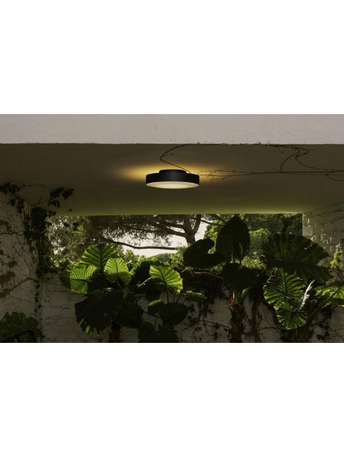 The Marset Plaff-on 50 is a wall and ceiling lamp with a diameter of 50 cm. It consists of a lacquered aluminum ring with a mouth blown opal glass diffuser. Most of the light is emitted directly. The aluminum ring around the diffuser also directs the light indirectly, creating a halo on the ceiling or wall. From the inside the ring is always white, from the outside it is in black. The Plaff-on 50 is available as a halogen or LED version. The halogen version can be operated with LED retrofit lamps. The LED version has an integrated LED. Both versions can be dimmed on site. On request, the LED version is also available as a DALI dimmable version. With protection class IP54, this lamp can be used as an outdoor lamp. It is protected against dust and splashing water from all sides.