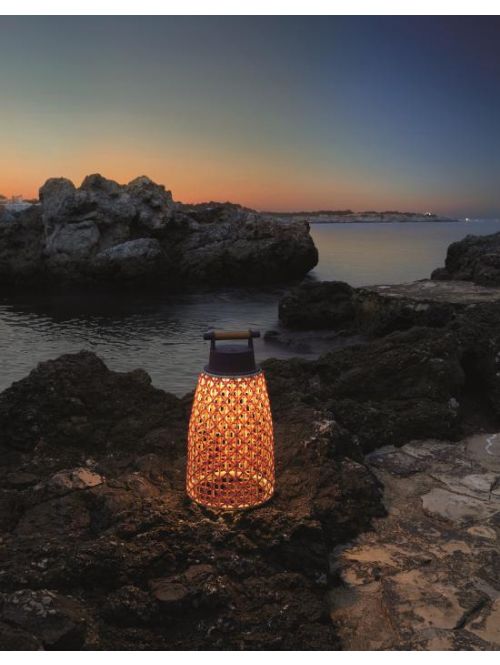The lamp shade of the Bover battery lamp is made of a hand-woven, synthetic polyethylene fibre. It is available in the colours red, brown and beige. The upper part of the lamp including the handle is always in graphite brown. The Nans Portable M/41/R Outdoor is operated with an integrated LED that has a colour temperature of 2,700 Kelvin extra warm white. The light is emitted sideways and downwards, creating light reflections around the lamp.