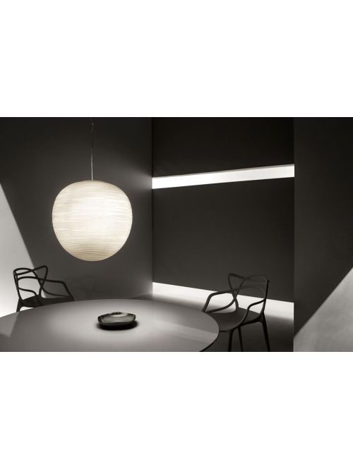 The Foscarini Rituals XL Sospensione is the largest of the four pendant lights from the Rituals series that resembles a lantern in its ease. In a complex method the mouth-blown, white satinated glass is provided with a unique grooves effect which creates light reflections on the glass when switched on. Through the glass the light is emitted glare-free and homogeneously into the room. The pendant lamp has a white canopy. The Rituals XL Sospensione has an E27 socket and can be operated with LED retrofits.