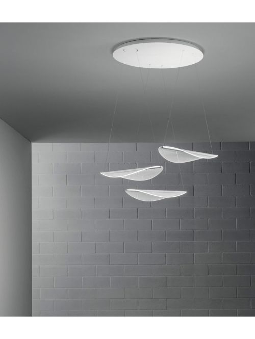 The Stilnovo Diphy P3 is a pendant lamp with three diffusers. The three diffusers hang from a round canopy. Through small openings in the canopy, the cables of each lamp can be individually adjusted in their position in order to change the arrangement of the diffusers. Each diffuser is illuminated by an LED in a light rod, emitting the light both upwards and downwards. When the light is switched off, the diffusers appear transparent. When the light is switched on, a dot pattern engraved by laser is visible on the diffusers. For this effect the OptiLight technology was used in the production of the diffusers. The dot pattern is based on the petals of the Asian flower Diphylleya Grayi, after which the lamp series was named. The pendant lamp can be dimmed on site and set in height if required. With an optionally available Casambi module, the light can be dimmed via smartphone.