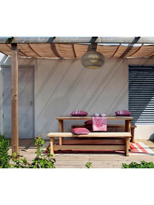 The Garota PF/02 Outdoor ceiling lamp by the Spanish manufacturer Bover has a round lamp shade made of synthetic wickerwork. The light of the Bover Garota PF/02 Outdoor is emitted directly downwards and through the wickerwork to the sides. This ceiling light is available in the shade colours ivory white and brown. This lamp has a stainless steel ceiling bracket with an epoxy polyester lacquered finish. The lamp with an ivory white shade has a white ceiling bracket, the one with a brown shade has a graphite brown ceiling bracket.