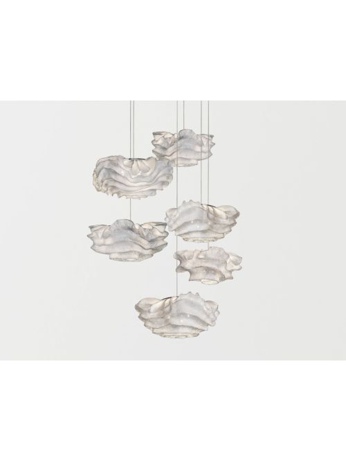 The Arturo Alvarez Nevo NE04-6 pendant lamp is offered in the surfaces white and grey. On request, the lamp is also available in taupe and beige. The Nevo NE04-6 consists of six lamps of the Nevo series which together produce a warm room light. There are three lamps of the NE06P and three lamps of the NE04-1 which are mounted on a canopy with a diameter of 60 cm. The transparent cables can be shortened if necessary. The Arturo Alvarez Nevo NE04-6 pendant lamp is supplied with twelve lamps with an E14 socket. This lamp can be operated with LED retrofits. This lamp has a total height of 250 cm and stands out for its use of the extremely flexible material Painted stainless steel mesh. This material was developed exclusively by the Brand Arturo Alvarez and allows the designer an enormous creative freedom.