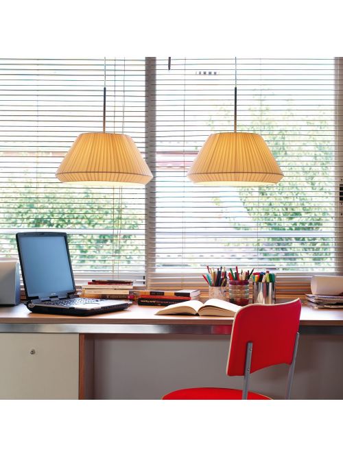 The Bover Mei 38 is a pendant lamp with a textile lampshade made of wrapped pleated textile and a transparent cable. The lampshade is available in several colours.