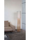 The Linn High Vertical by Maigrau is a floor lamp with a textile lampshade in the shape of a cylinder. The base of the lamp consists of several vertically arranged oak round rods that are attached to a ring made of powder-coated steel. This floor lamp is equipped with an infinitely variable foot dimmer and has a total height of 160 cm. This is the lamp with a lamp frame in oak natural.