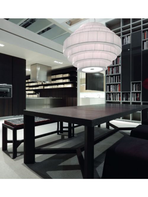 The pendant lamp Mos 03 is produced by the Spanish manufacturer Bover. The round shape of the lampshade is created by combining several rings of different sizes with a coating of translucent striped bands. The lampshade has a diameter of 120 cm and is 92 cm high. The lamp is suspended from a ceiling canopy with a diameter of 14 cm using thin steel tension cables. The maximum pendant length of the Bover Mos 03 is 220 cm. This pendant lamp with transparent cable is available in the shade colours white and cream. The light of this pendant is emitted directly downwards and through the translucent fabric of the lampshade. The Bover Mos 03 has E27 sockets and can be used with LED retrofit lamps.