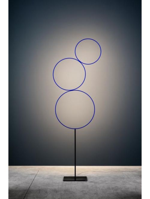 The Catellani & Smith Sorry Giotto 3 is a floor lamp with a lamp body of three rings. It has efficient, dimmable LED technology. Enzo Catellani designed this floor lamp in the year 2012 with a base and a lamp rod in waxed iron. The three ring-shaped light bodies made of copper are carefully painted blue by hand.