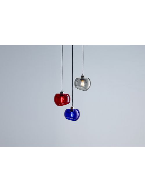 The Licht im Raum Glass Moons 3 Chandelier Fall consists of three lamps on a round canopy. The glasses of the pendant light are made with classic craftsmanship and are mouth-blown. The Glass Moons 3 Chandelier Fall has one lamp each with a steel grey, a cherry red and a cobalt blue glass.
