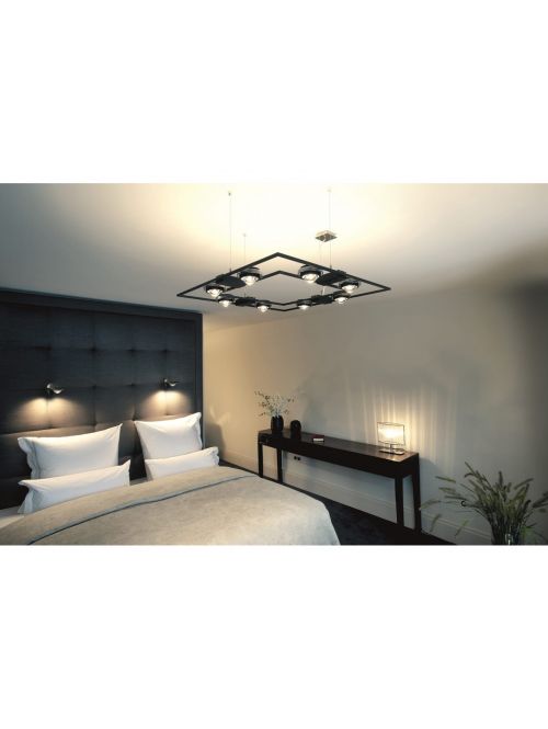 The Licht im Raum Ocular Square 710 LED is a pendant lamp with a square basic shape. It has a length and width of 71 cm each. Its eight lenses can be swivelled within the lamp. The light is emitted homogenously and focussed downwards through the eight lenses. The lenses each have a diameter of 67 mm. The Ocular lenses focus and control the light in a precise, glare-free manner, creating superior light quality.The lamp can be regulated via a rotary dimmer on the lamp.