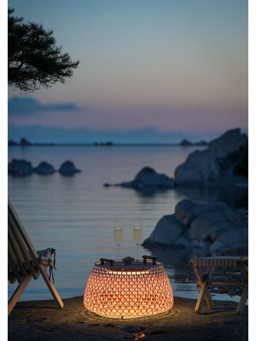 The Nans is an extensive collection of hand-woven products characterised by a cheerful weave of colour that blends easily into the architecture and landscape they are placed in. The shape of the Nans Bag reminds us of a large wicker basket. Due to its wide surface, we decided to cover the upper opening with an aluminium disc, transforming it into auxiliary objects that, in addition to providing light, also allow small objects to be stored. To make it easier to move them, we added two teak handles to the edge of the lid. The Bag allows the light tone to be adjusted at any time by setting the colour temperature of its shade via a manual push button at 2200K, 2400K, 2700K. Designed for outdoor use, the lamps are equipped with IP-44 protection. The battery charging time is approx. 7 hours. The battery life at 100% is approx. 6 hours, at 66% approx. 9 hours and at 33% approx. 12 hours. A USB-C charging cable is required for charging (not included).