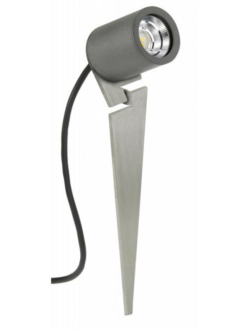The Albert 2399 spit spotlight made of corrosion-resistant cast aluminium and a borosilicate glass bulb cover has a 250 cm long cable with mains plug. The lamp head, which can be swivelled by 120 degrees, has a diameter of 6.5 cm and is 9 cm deep. The ground spike of the outdoor spotlight allows the lamp to be placed anywhere on unpaved beds and green areas. This lamp with IP44 protection has a replaceable bulb.