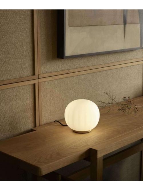 The Luceplan Lita table lamp D92V18 has a diffuser of mouth-blown, satin opaline glass. The diffuser is 18 cm in diameter and 15 cm high. The vertical grooves on the surface of the diffuser create slight light reflections when the light is switched on. The base has a diameter of 10 cm and is offered in the versions brass or white lacquered aluminum. The Lita Tavolo D92V18 is in total 16 cm high. A dimmer is integrated on the supply line. LED retrofit lamps or halogen lamps can be used for this table lamp.