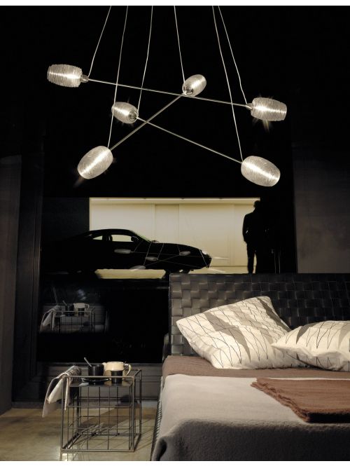 The Vistosi Damasco SP 6 pendant lamp has six glass diffusers made of hand-blown and hand-worked crystal glass. The metal rods with the glass diffusers can be individually angled to each other.